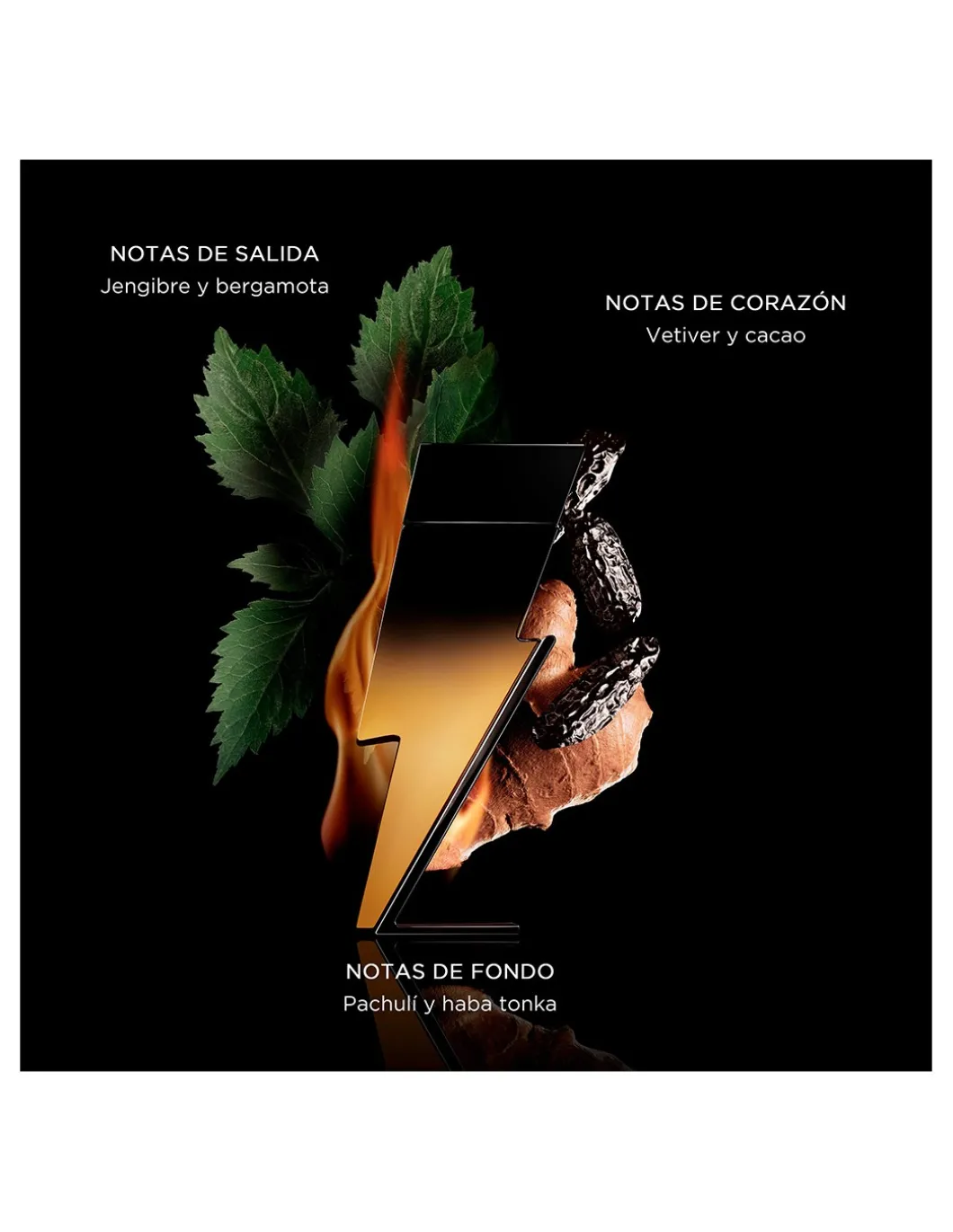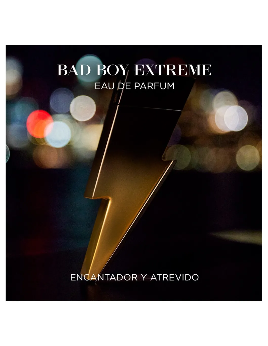 BAD BOY EXTREME reinterpreta el emblemático rayo BAD BOY con un frasco en degradado negro y dorado, una materialización de la atrevida fragancia aromática que contiene.
