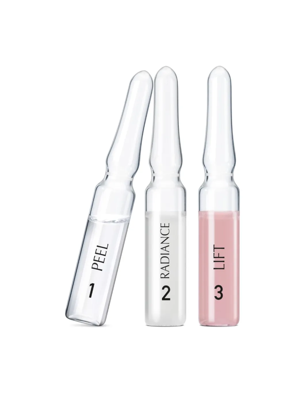 1. Abrir la ampolla PASO 1 – PEEL como se indica y aplicar todo el contenido sobre la piel limpia y tonificada. Dejar actuar 8 minutos y retirar con agua tibia.