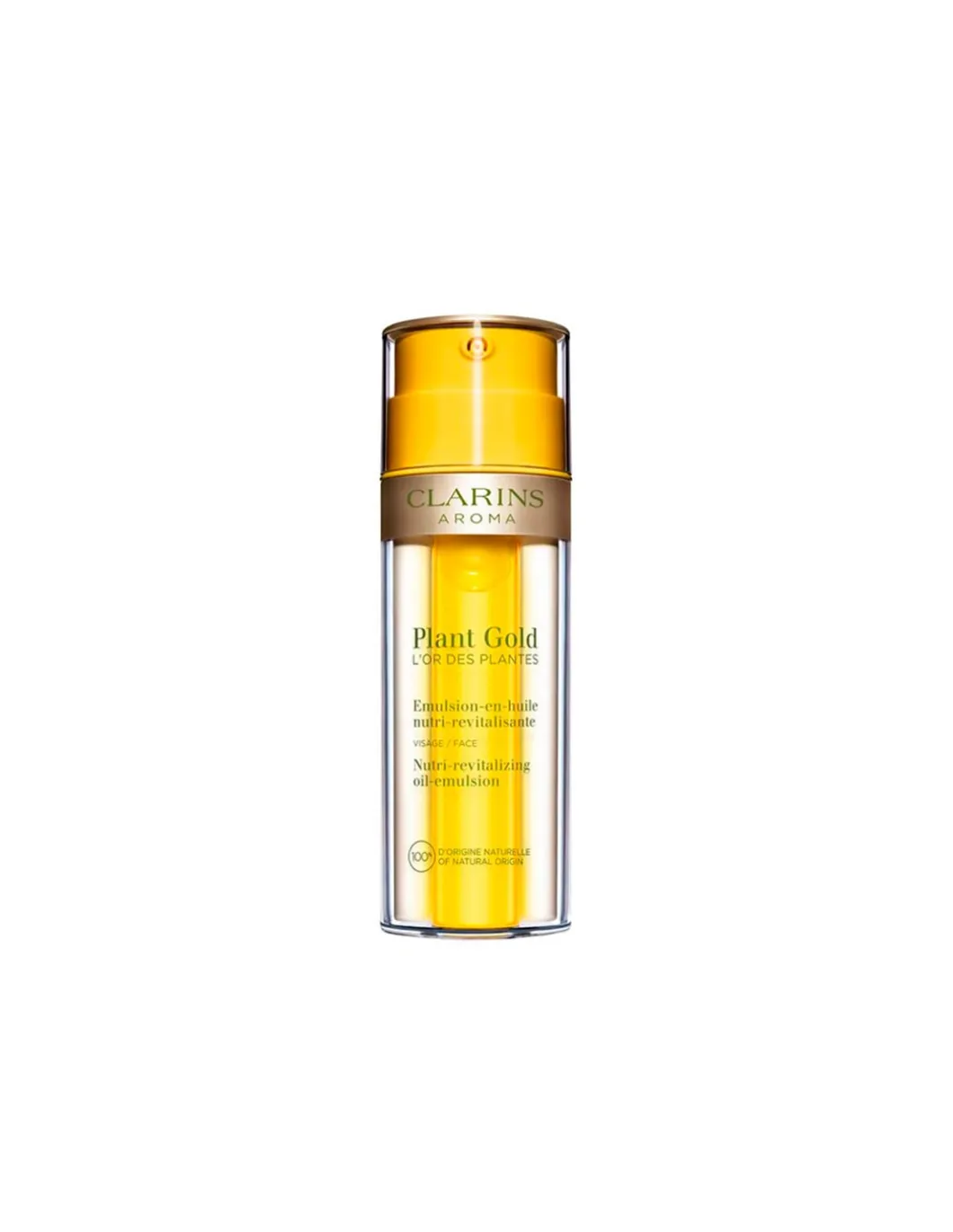 Esta emulsión en aceite proporciona comodidad, vitalidad y luminosidad a la piel. Plant Gold de Clarins está formulado con ingredientes 100% de origen natural; el extracto de orquídea azul y el aceite esencial de pachulí ayudan a tonificar, restaurar la luminosidad y la vitalidad de la piel. La mezcla de la avellana, los aceites vegetales de almendras dulces, macadamia y semillas de uva, suavizan y nutren por su alto contenido de ácidos grasos. Como resultado, la piel se siente hidratada, nutrida y radiante con una textura sedosa no grasa. Clarins Plant Gold está indicada para todo tipo de pieles.