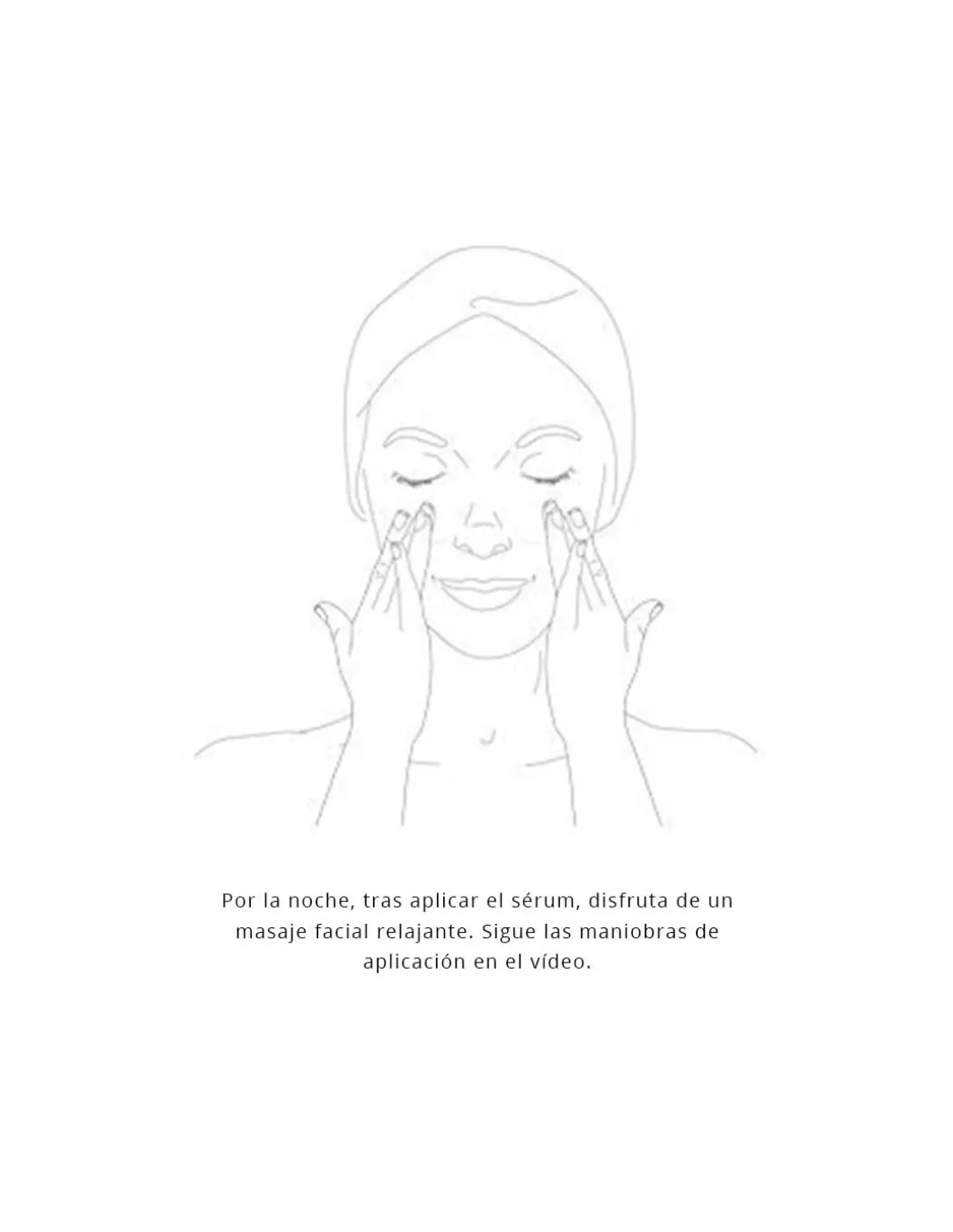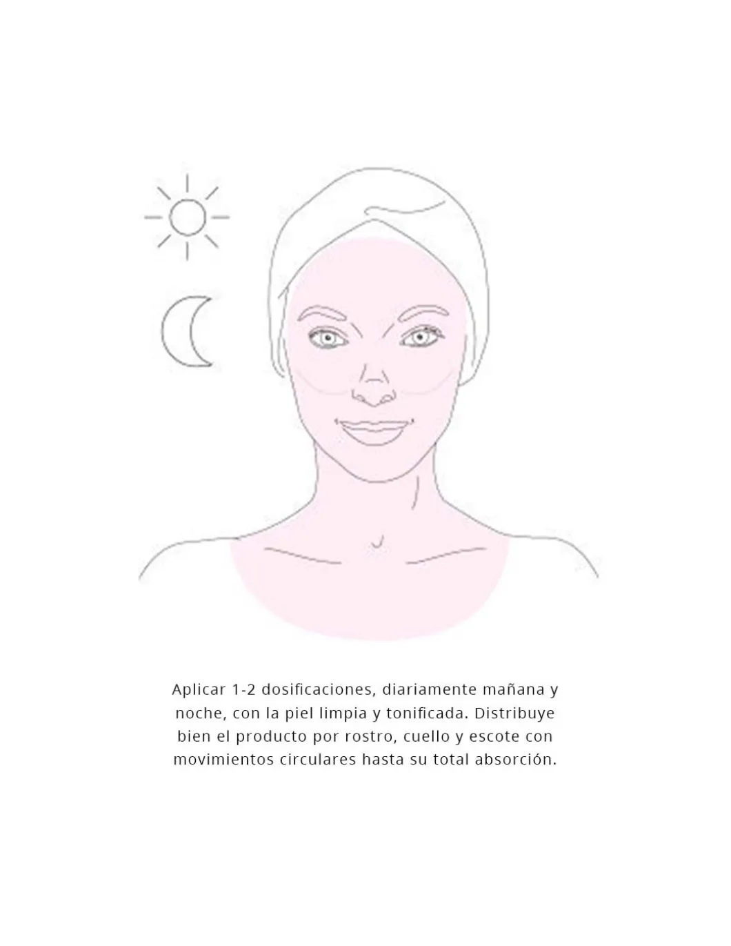 Aplica 1-2 dosificaciones, diariamente mañana y noche, con la piel limpia y tonificada. Distribuye bien el producto por rostro, cuello y escote con movimientos circulares hasta su total absorción. Después del sérum, aplica tu crema habitual.