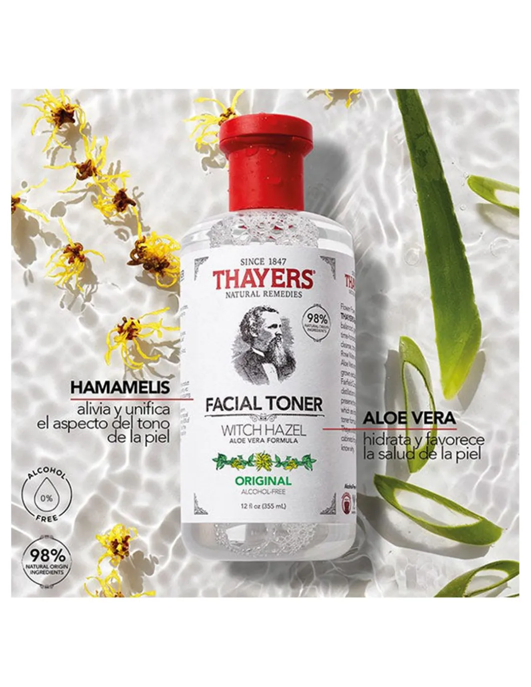 Witch Hazel – Extraído sin alcohol, calma y unifica la apariencia del tono de la piel