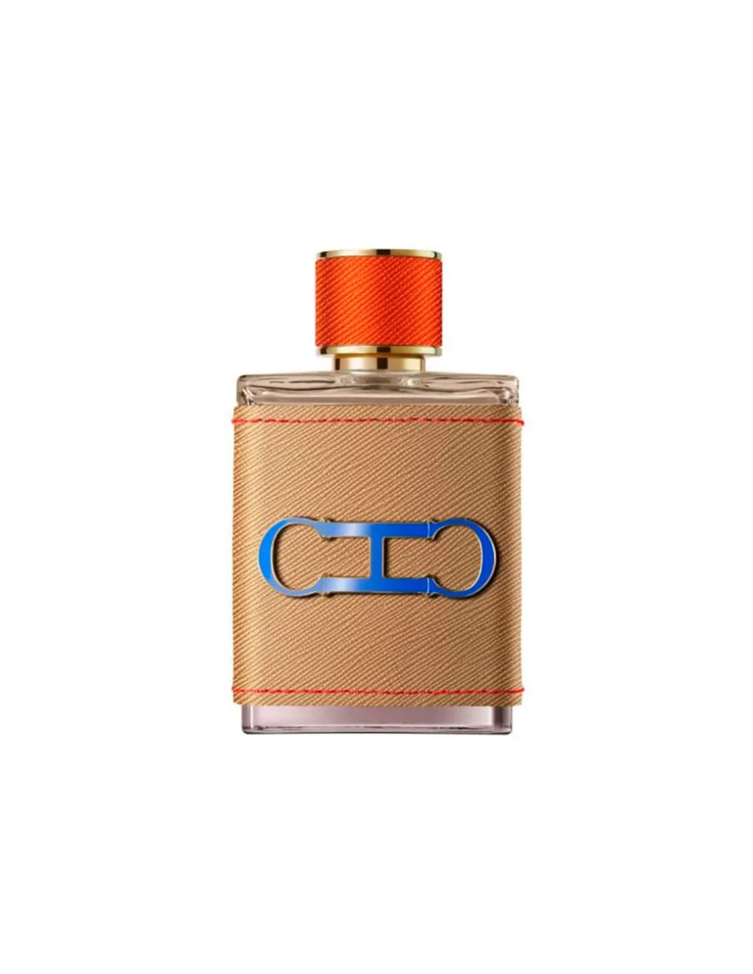 El frasco: acentuado con efecto de cuero presenta costuras en contraste de color naranja picante, el logotipo es Insignia brillante y azul eléctrico.