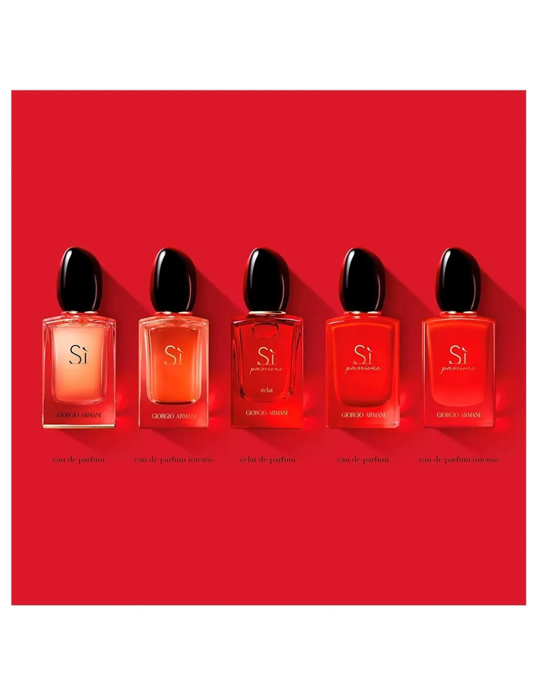 En un deslumbrante rojo rubí, el brillo del frasco de perfume Sì Passione brilla como una piedra preciosa, una alusión a la forma en la que la pasión puede iluminar nuestra vida, con un tono rojo candente que se revela cuando la luz incide sobre el frasco.