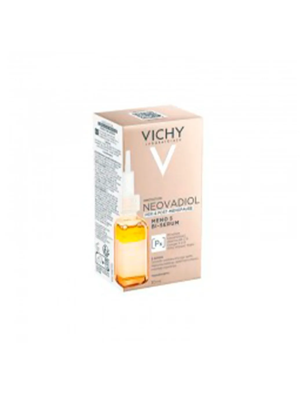 Vichy Neovadiol Peri & Post Menopausia Meno5 Bi-Sérum está diseñado para compensar los impactos visibles de la menopausia en la piel ya que combina agua volcánica de Vichy enriquecida con 15 minerales, con proxylane, extracto de cassia, un trío de vitaminas B3, CG (mejora la uniformidad de la piel) , E (antioxidante) y omegas de aceites vegetales.
