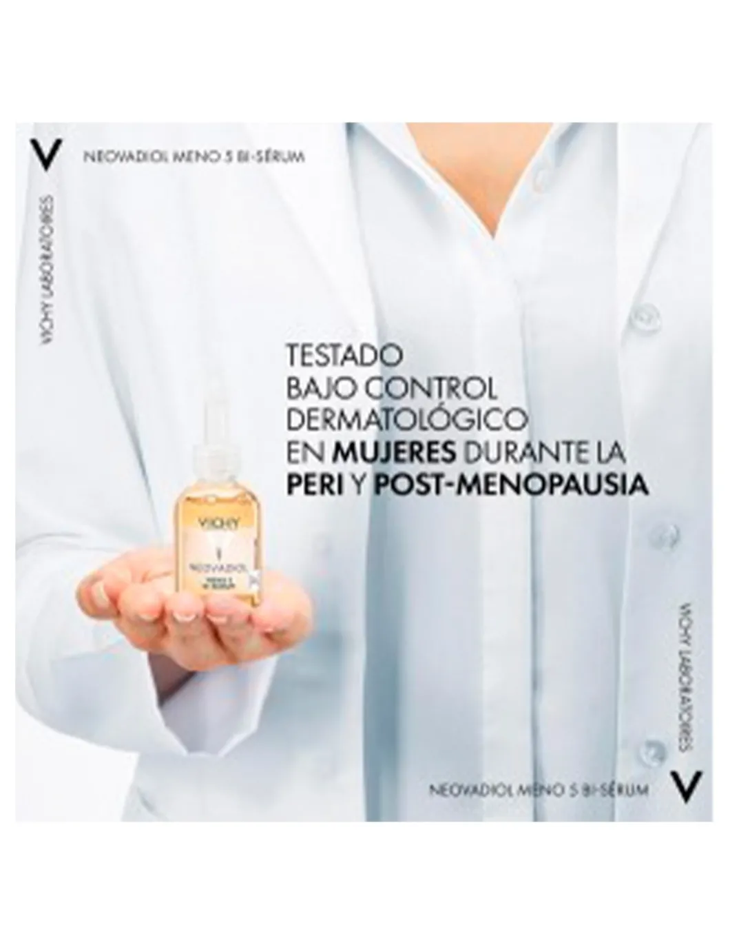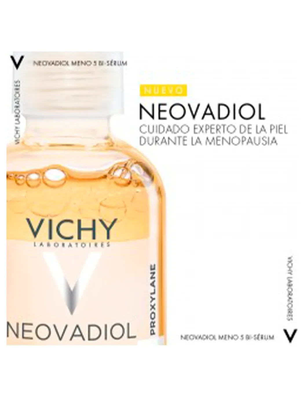 Vichy Neovadiol Peri & Post Menopausia Meno5 Bi-Sérum ofrece 5 beneficios principales: redefine el contorno, aumenta la luminosidad, nutrición, antiarrugas y corrige las manchas de la edad.