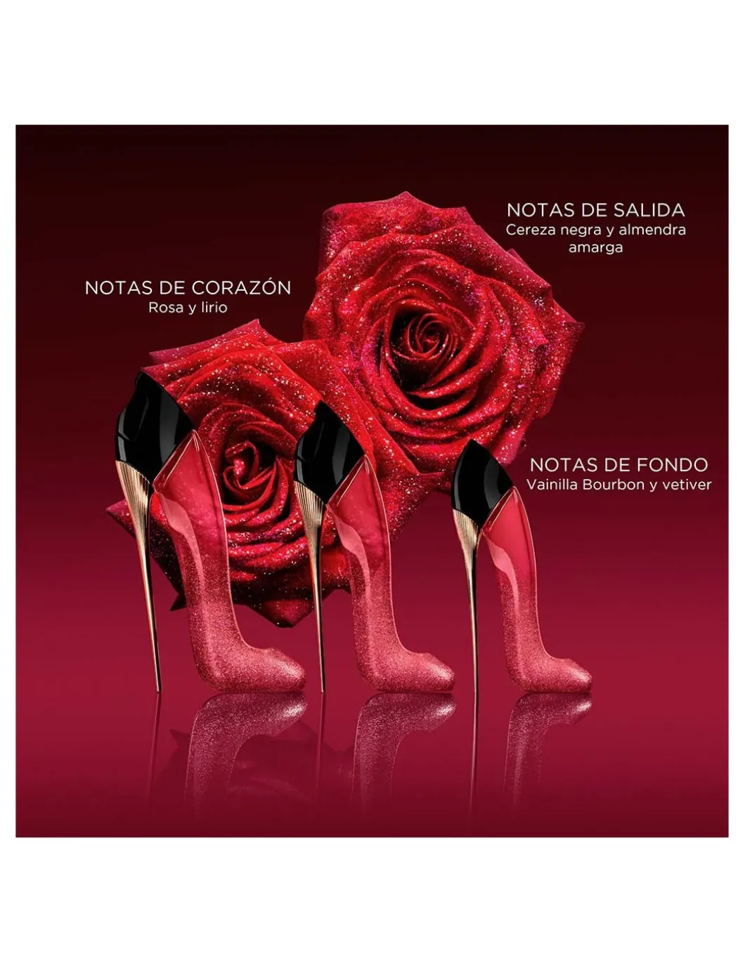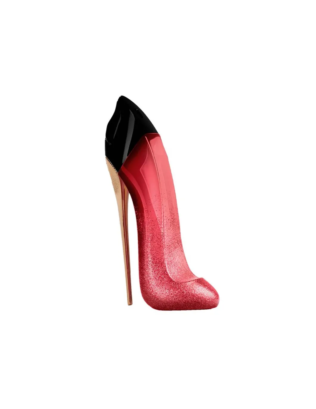 Very Good Girl Glam Parfum ofrece una intensa nota superior a cereza en un brillante frasco en forma de zapato de tacón de color rojo-cereza intenso empapado en una deslumbrante y glamurosa cascada de brillos. El agua de rosas amplifica la nota central de la fragancia elevándola de eau de parfum a perfume intenso, mientras que el final a vetiver y vainilla Bourbon, obtenidos de forma sostenible, intensifica su profundidad y contraste.