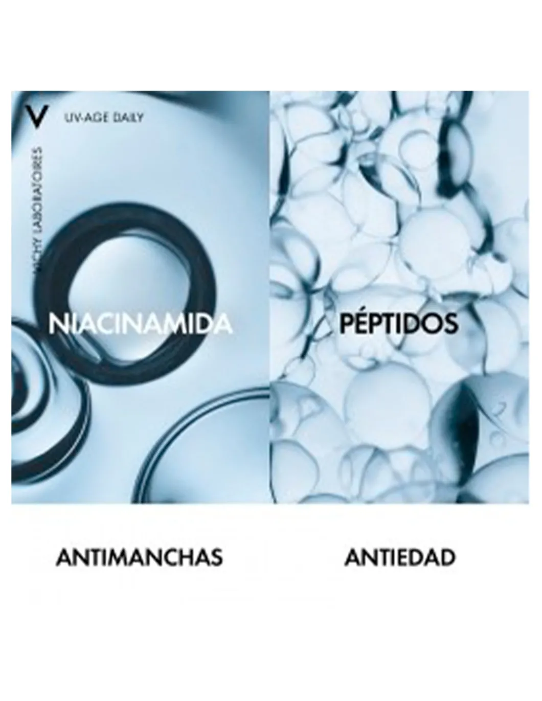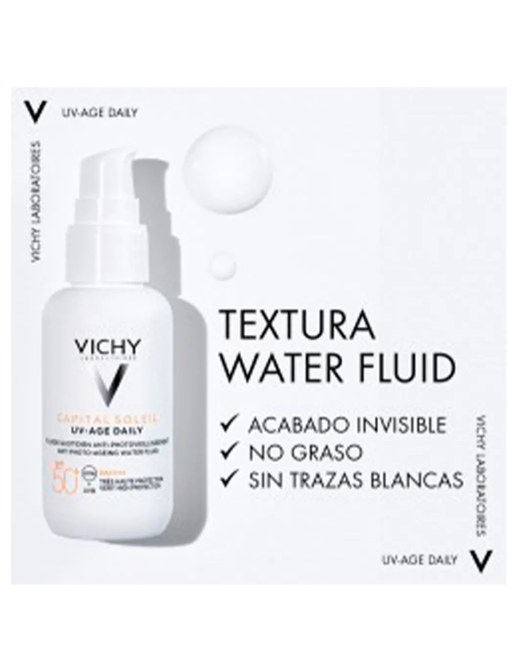 Vichy Capital Soleil UV-Age Daily Water Fluid es un fluido antienvejecimiento antioxidante con péptidos antiedad, niacinamida, agua volcánica Vichy y fracciones probióticas, además de ofrecer una protección solar UVA/UVB SPF50+.