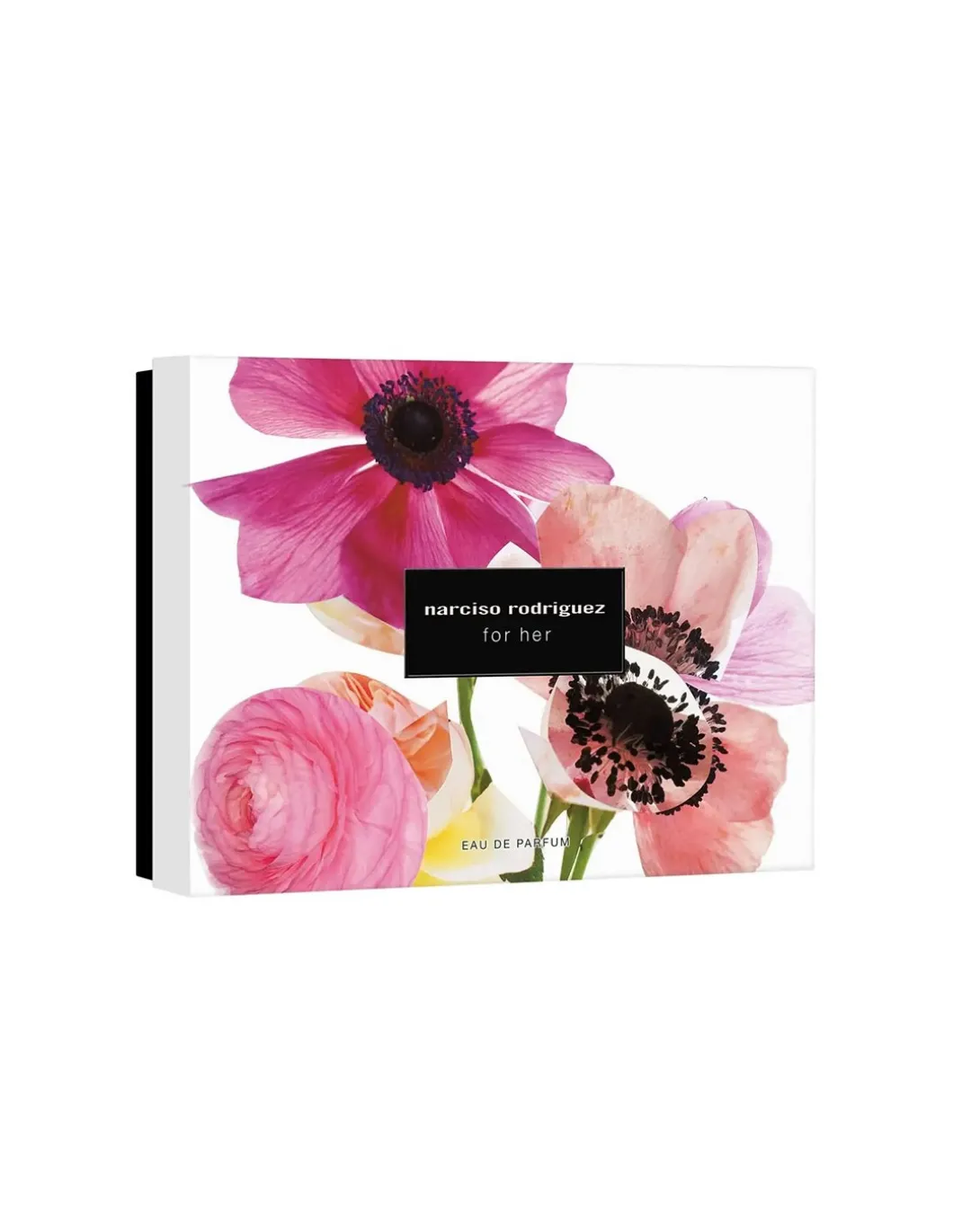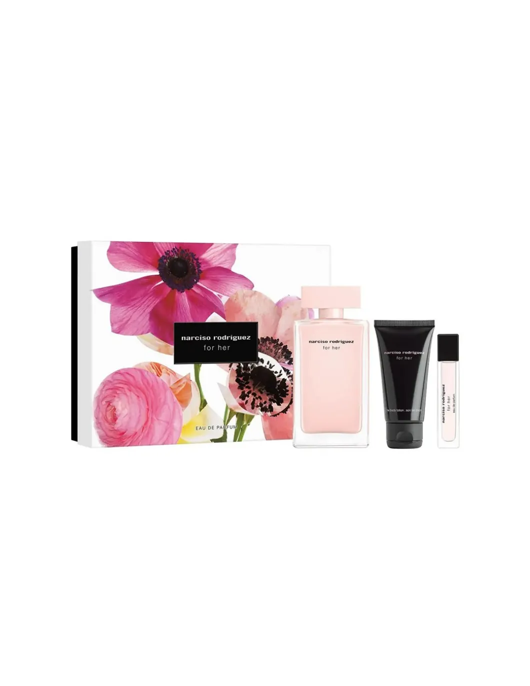 Este estuche incluye: Narciso Rodríguez For Her Eau De Parfum 100ml + Narciso Rodríguez Loción corporal perfumada 50ml + Narciso Rodríguez For Her Eau De Parfum mini 10ml.