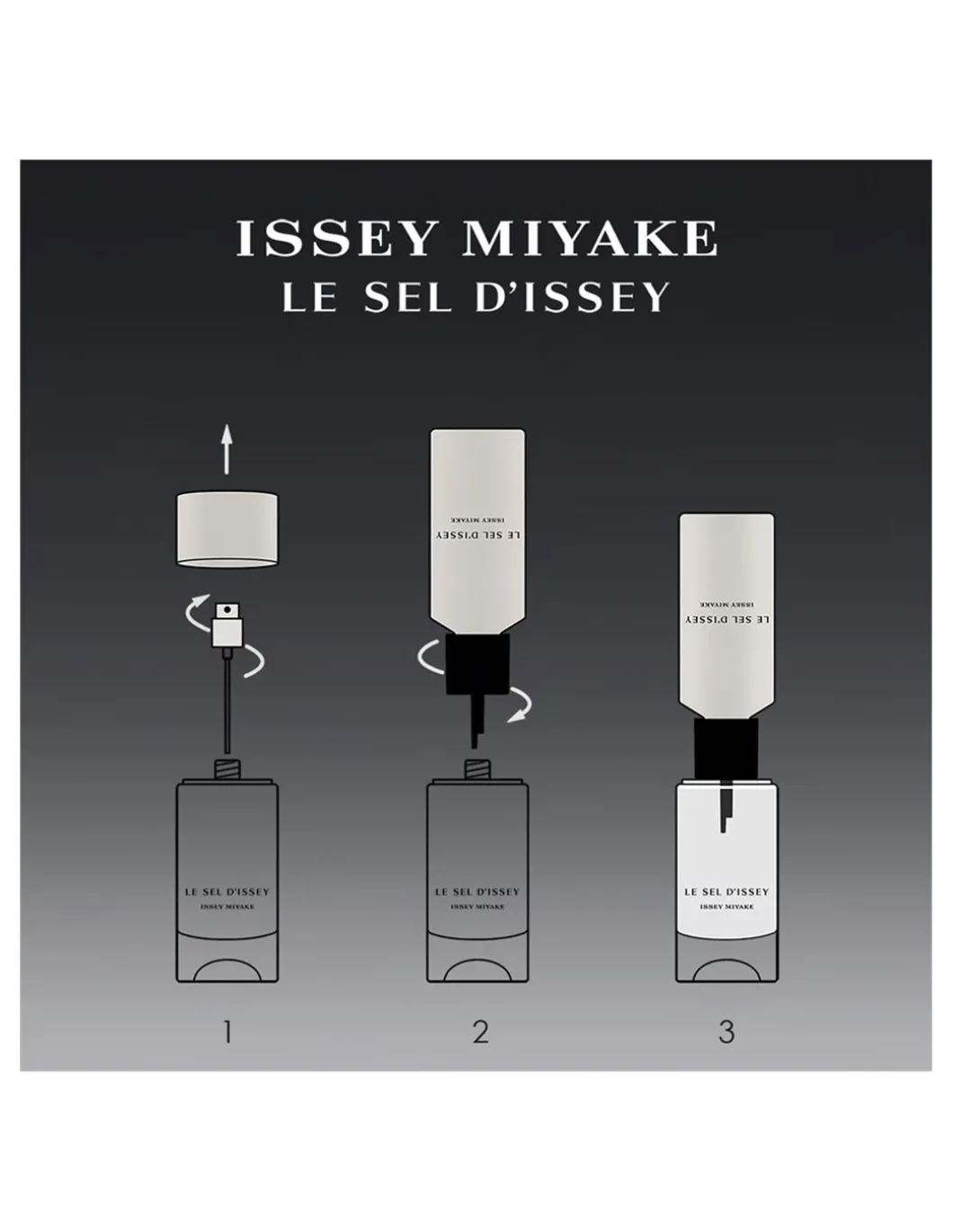 Aplicar el gel de ducha corporal Le Sel D’Issey. A continuación, aplicar Le Sel dIssey sobre la piel, vaporizando sobre los puntos de pulso: cuello, muñecas y pliegue de los codos, para amplificar la intensidad de la fragancia.