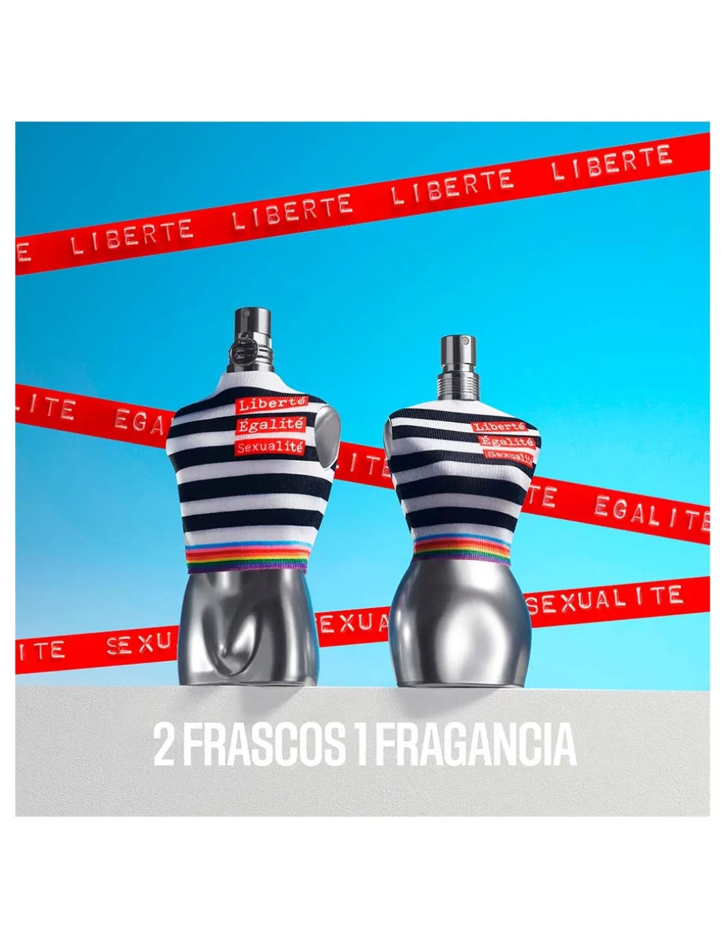 En marcha para defender con orgullo los valores de su creador, el frasco de culto Classique hace de sus curvas cromadas un manifiesto Jean Paul Gaultier. ¡Que viva nuestra “Libertad, igualdad, sexualidad”! Su mítica camiseta marinera de tirantes, de rayas azul oscuro y arcoíris, manifiesta su compromiso en un rojo vibrante.