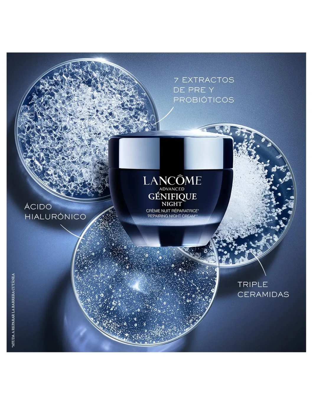 Nueva crema de noche anti-edad Advanced Génifique Noche, ahora con la ciencia del microbioma, para potenciar el poder regenerativo de la piel durante la noche. Su fórmula contiene los activos necesarios para conseguir una hidratación intensa y ayudar a la reparación de la barrera cutánea, recuperándola de los daños sufridos durante el día. Noche tras noche, piel más fuerte, visiblemente más joven y luminosa.