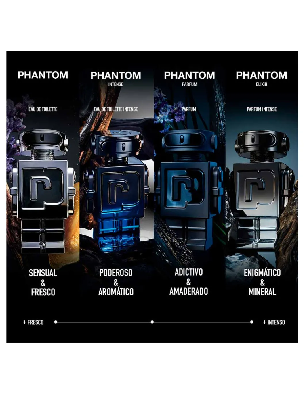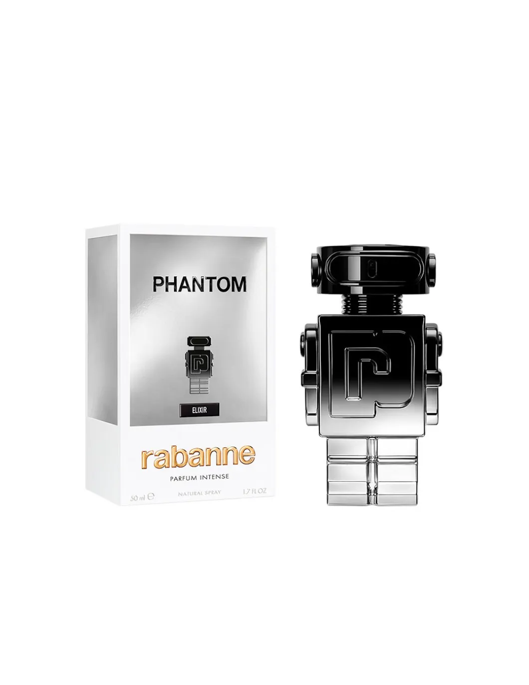 Inspirado en el París nocturno, donde las sombras se encuentran con la luz, el elegante frasco de PHANTOM Elixir se presenta en un intenso degradado brillante de negro a plateado para reflejar el contraste olfativo de su interior.