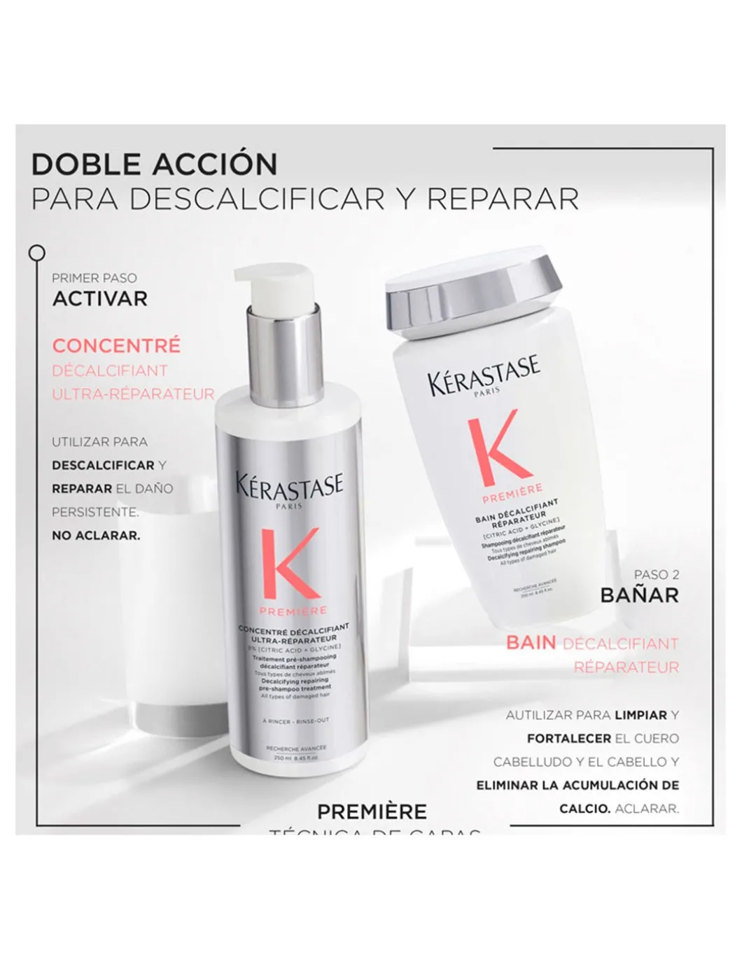 Concentración de 8% de ácidos puros para descalcificar y reparar el cabello en profundidad.