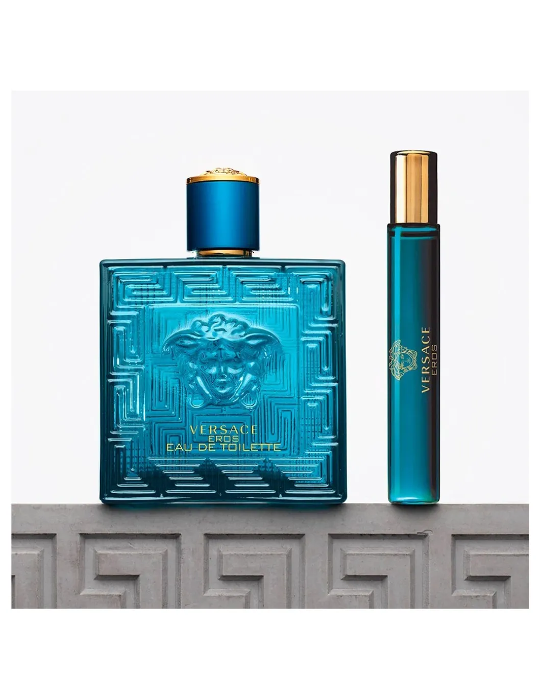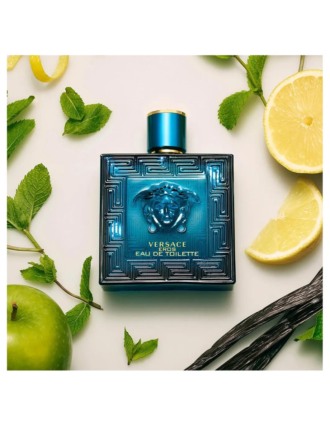 Eros es la fragancia que interpreta la sublime masculinidad a través de un aura luminosa con una frescura intensa, vibrante y resplandeciente, obtenida de la combinación de hojas de menta, cáscara de limón italiano y manzana verde. Una adictiva sensualidad gracias a las notas orientales, intrigantes y envolventes de las habas tonka, el ámbar, la flor de geranio y la vainilla. Una enérgica virilidad simbolizada por maderas como el cedro de Atlas y Virginia, el vetiver y el musgo de roble, que proporcionan intensidad y potencia.